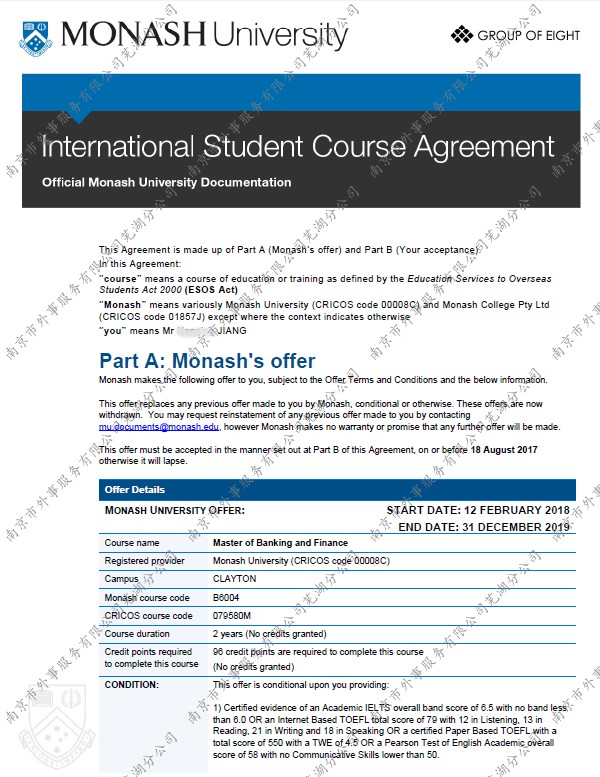 澳洲莫纳什大学银行与金融专业硕士offer