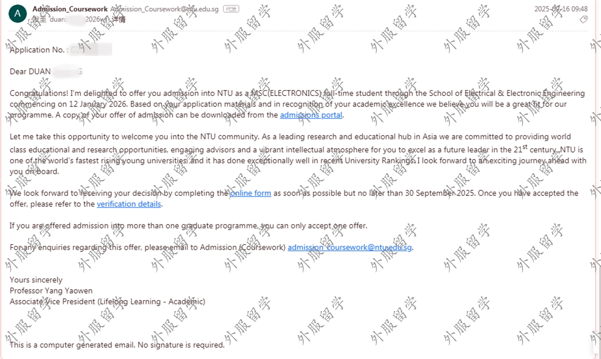 新加坡南洋理工大学电子学专业硕士offer
